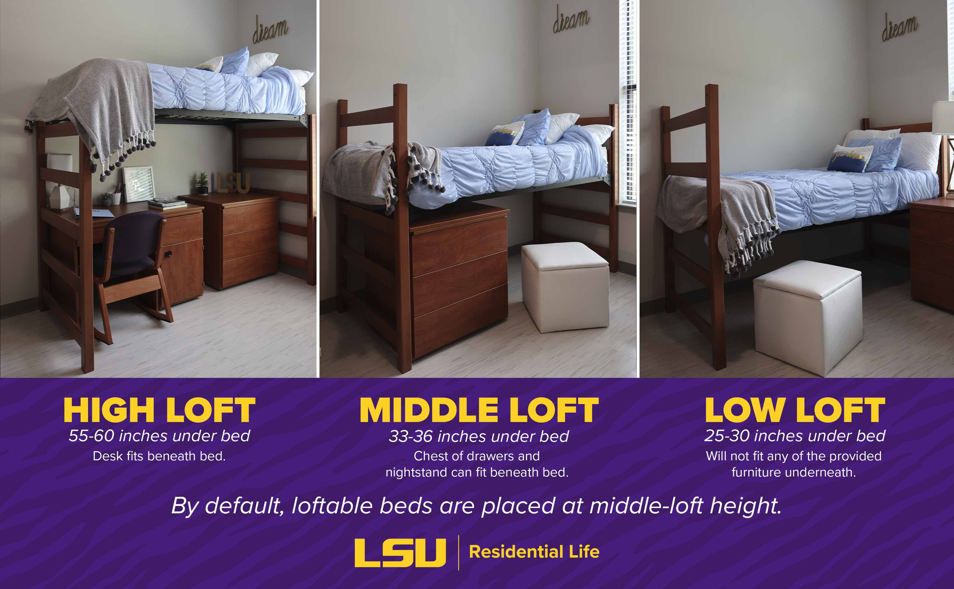 - Rooms with loftable style beds can request a high loft or low loft position during appointment scheduling. Not choosing a loft option keeps the bed at its default mid-height position.